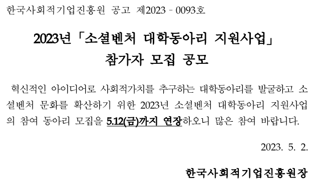 [연장공고] 2023년 소셜벤처 대학동아리 지원사업 모집 공고(~5.12.(금) 18시)